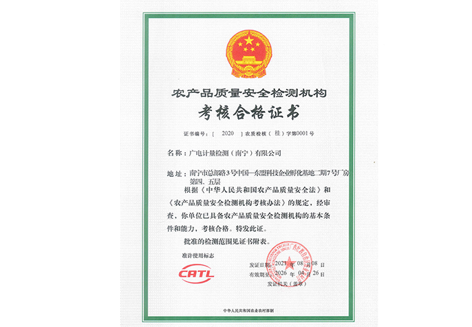 農(nóng)產(chǎn)品質(zhì)量安全檢測機構(CATL)合格證書-廣電計量(南寧)有限公司