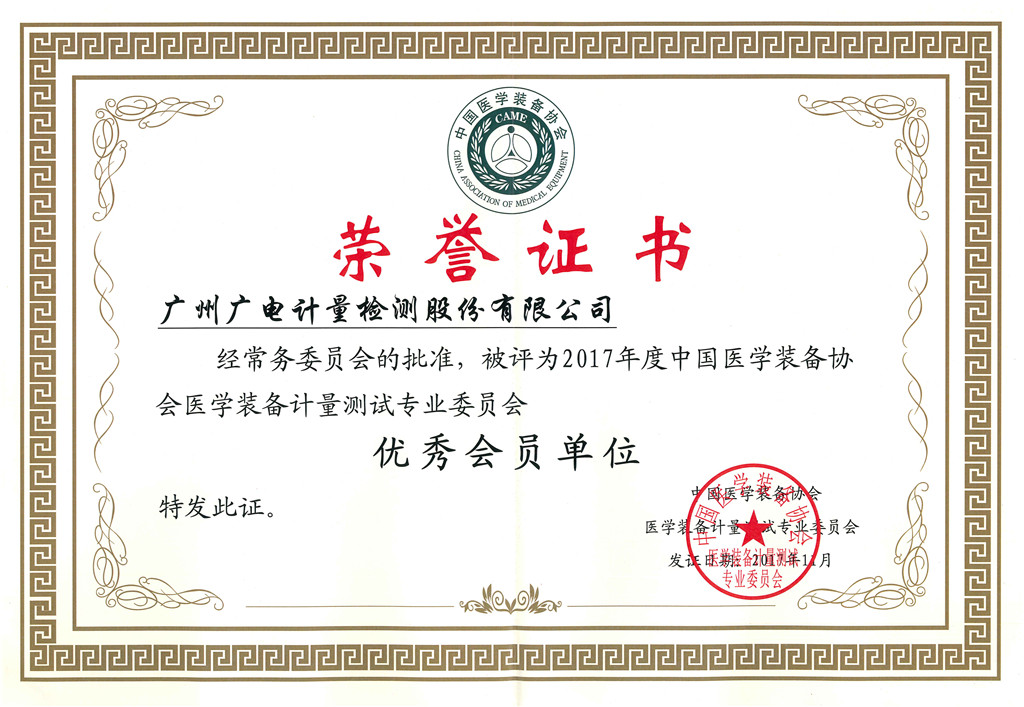 2017年度中國醫(yī)學裝備協(xié)會醫(yī)學裝備計量測試專業(yè)委員會優(yōu)秀會員單位