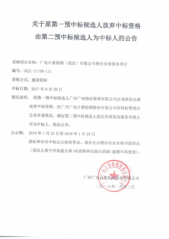 關于原第一預中標候選人放棄中標資格由第二預中標候選人為中標人的公告
