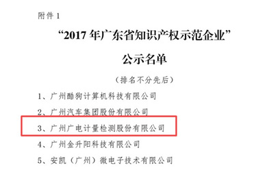 “廣州廣電計量檢測股份有限公司”等20家企業入選“2017年度廣東省知識產權示范企業”名單。