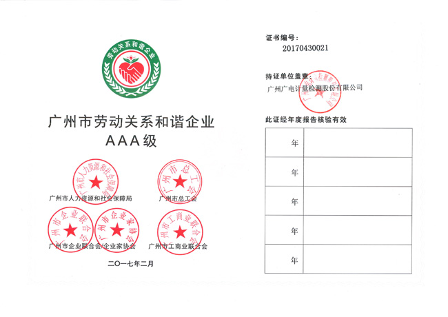 “廣州市勞動(dòng)關(guān)系和諧企業(yè)AAA級(jí)”榮譽(yù)證書