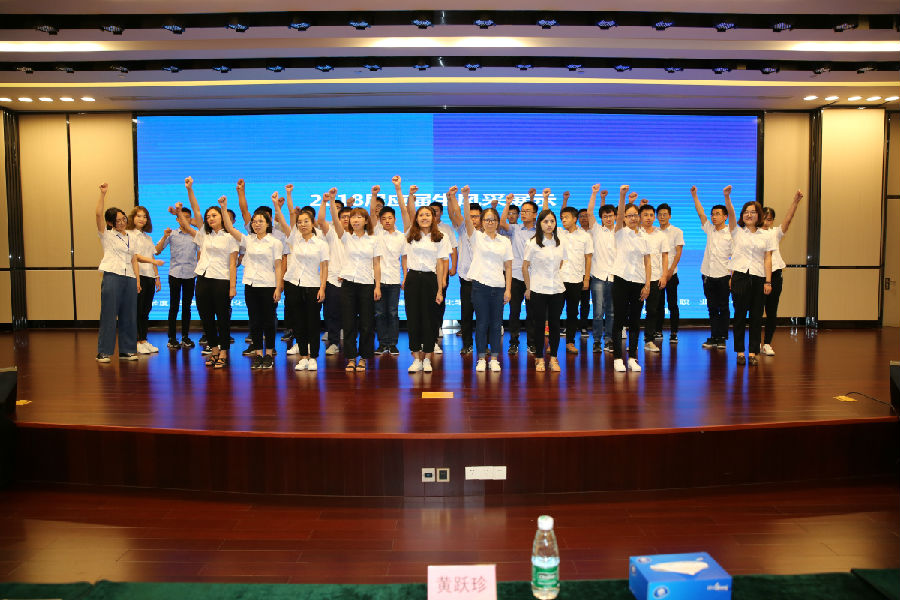 新青年,展示新面貌。授旗儀式結束,現場應屆生分成十個小組,先后上臺進行風采展示,另外湖南子公司、河南子公司、無錫子公司三個分會場的應屆生也通過遠程視頻一一亮相。他們用創意的造型,響亮的隊名秀出了新生力的青春風采,用“環境使我成長,可靠使我光榮”、“做精測,毫厘必爭;扛砝碼,千斤不懼”、“食檢環測,青山綠水民安國康”等響亮的口號展示了新生力的昂揚面貌。