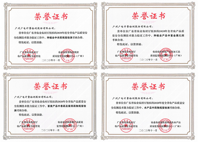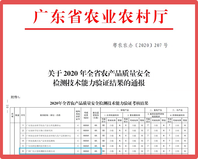 近日,廣東省農(nóng)業(yè)農(nóng)村廳發(fā)布《關于2020年全省農(nóng)產(chǎn)品質(zhì)量安全檢測技術能力驗證結果的通報》。本次能力驗證共有全省195個農(nóng)產(chǎn)品檢驗檢測機構(或?qū)嶒炇遥﹨⒓樱己丝傮w合格率78.5%,其中考核結果為4A 級單位19個。廣州廣電計量檢測股份有限公司參加全部項目并獲得4A級別;食品檢測實驗室李冰虹、袁浪、郭楚紅、林緒、鄧麗紅、李庚、藍夢哲等7人獲能力驗證工作優(yōu)秀檢測人員表彰。