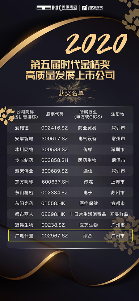 近期,由廣東時(shí)代傳媒集團(tuán)推出的“第五屆時(shí)代金桔獎(jiǎng)高質(zhì)量發(fā)展上市公司”評(píng)選結(jié)果揭曉。憑借規(guī)范的公司治理、卓越的董事會(huì)建設(shè)和優(yōu)秀的投資者關(guān)系管理,廣電計(jì)量入選“2020年第五屆時(shí)代金桔獎(jiǎng)高質(zhì)量發(fā)展上市公司”榜單。