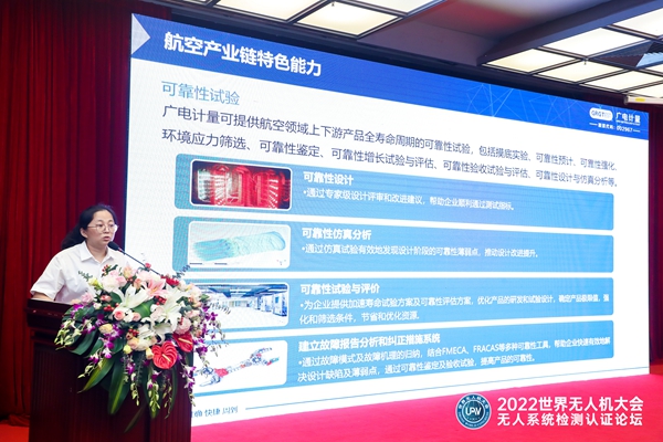 檢測傳遞著產(chǎn)業(yè)鏈上下游及消費者對產(chǎn)品的信心。在無人機蓬勃發(fā)展的今天,計量檢測機構(gòu)為產(chǎn)品質(zhì)量的確認(rèn)與鞏固提供了重要的技術(shù)基礎(chǔ)。會上,針對無人機檢測市場目前仍處于市場起步階段,企業(yè)對無人機檢測存在著普遍的信息不對稱問題,廣電計量無人裝備及機器人技術(shù)副總監(jiān)張曉瑾博士作主題分享,詳細(xì)介紹了無人機行業(yè)所面臨的主要產(chǎn)品質(zhì)量及性能挑戰(zhàn),分析了無人裝備目前的主要檢測需求,并向與會人員分享了廣電計量在無人機檢測領(lǐng)域的八大板塊能力,闡述計量檢測機構(gòu)如何助力無人機產(chǎn)業(yè)高質(zhì)量發(fā)展。