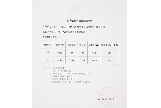 GRGT近期收到環(huán)境保護部標準樣品研究所關于“IERM T14-09 沉積物中重金屬檢測”能力驗證計劃結果通知單,結果顯示我司化學分析測試中心檢測結果全部為中值,成績突出,順利通過本次能力驗證。
