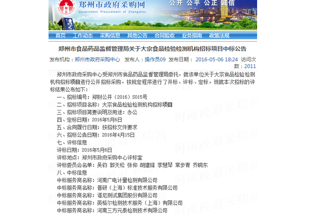 5月6日,鄭州市政府采購中心公布了鄭州市食品藥品監督管理局大宗食品檢驗檢測機構招標項目的評標結果,廣電計量以總分第一的成績成功中標。