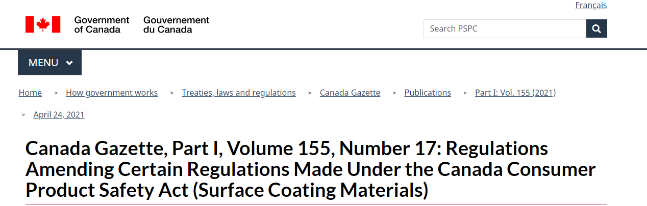 近日,加拿大衛生部在官方公報(Canada Gazette)上發布加拿大消費品安全法案(CCPSA)管控下的表面涂層材料法規(Surface Coating Materials Regulations)更新的提議,公眾評議期70天,于2021年7月3日結束。