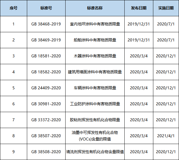 A:2020年3月7日,國標委公布由國家市場監(jiān)督管理總局(國家標準化管理委員會)批準的《木器涂料中有害物質(zhì)限量》等7項國家標準。2019年發(fā)布的GB 38468-2019《室內(nèi)地坪涂料中有害物質(zhì)限量》等2項國家標準,涉及四類分別是:涂料、膠粘劑、油墨以及清洗劑的標準。