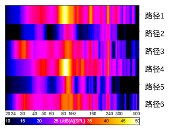 再次預(yù)測(cè)空調(diào)管路對(duì)車內(nèi)的貢獻(xiàn),特征頻帶的共振帶明顯減弱:
