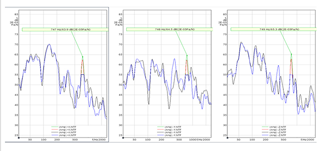 進(jìn)一步分析NTF(力聲傳遞函數(shù))可以看出空調(diào)管路三個(gè)方向的NTF在特征頻帶都有較高的峰值,如下圖: