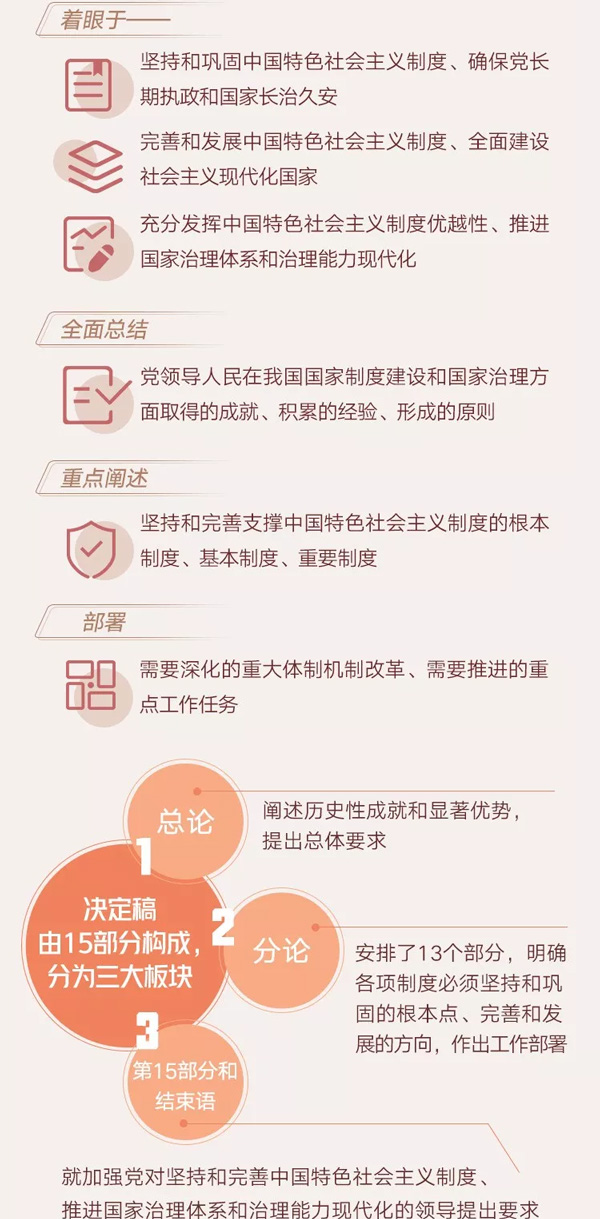 決定稿由15部分構成,分為三大板塊。第一板塊為第一部分,是總論,主要闡述中國特色社會主義制度和國家治理體系發展的歷史性成就、顯著優勢,提出新時代堅持和完善中國特色社會主義制度、推進國家治理體系和治理能力現代化的重大意義和總體要求。第二板塊為分論,聚焦堅持和完善支撐中國特色社會主義制度的根本制度、基本制度、重要制度,安排了13個部分,明確了各項制度必須堅持和鞏固的根本點、完善和發展的方向,并作出工作部署。第三板塊為第十五部分和結束語,主要就加強黨對堅持和完善中國特色社會主義制度、推進國家治理體系和治理能力現代化的領導提出要求。