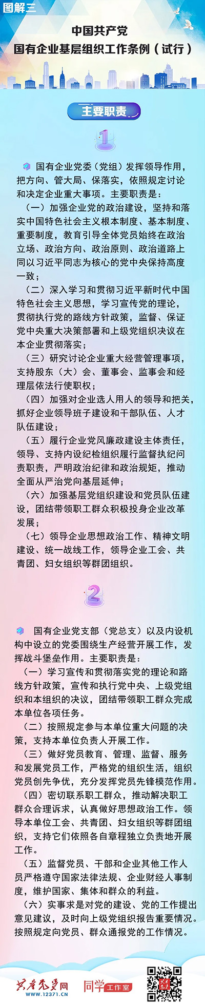 國(guó)有企業(yè)是中國(guó)特色社會(huì)主義的重要物質(zhì)基礎(chǔ)和政治基礎(chǔ),是黨執(zhí)政興國(guó)的重要支柱和依靠力量。堅(jiān)持黨的領(lǐng)導(dǎo)、加強(qiáng)黨的建設(shè)是國(guó)有企業(yè)的“根”和“魂”,是我國(guó)國(guó)有企業(yè)的光榮傳統(tǒng)和獨(dú)特優(yōu)勢(shì)。《中國(guó)共產(chǎn)黨國(guó)有企業(yè)基層組織工作條例(試行)》以習(xí)近平新時(shí)代中國(guó)特色社會(huì)主義思想為指導(dǎo),深入貫徹黨的十九大和十九屆二中、三中、四中全會(huì)精神,貫徹黨章要求,對(duì)國(guó)有企業(yè)黨組織工作作出全面規(guī)范,是新時(shí)代加強(qiáng)國(guó)有企業(yè)黨的建設(shè)的基本遵循。