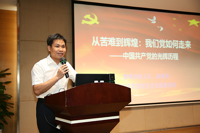 隨后,會議還特別邀請到了中共廣州市委黨校(廣州行政學(xué)院)黨史黨建教研部副主任、副教授,華南師范大學(xué)碩士生導(dǎo)師黎明澤向與會黨員分享黨課《中國共產(chǎn)黨的光輝歷程》。黎明澤教授從“破繭:生于亂世先天不足” “苦難:歷史與人民的選擇”和“輝煌:曲折后的偉大創(chuàng)造”三個歷史階段,與大家一起重溫了中國共產(chǎn)黨從成立到發(fā)展壯大至今的波瀾壯闊、跌宕起伏的奮斗歷程。