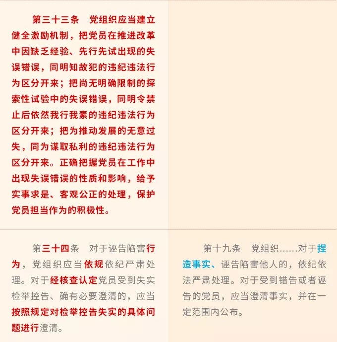 總結有關經(jīng)驗做法和創(chuàng)新性制度,新增了系列保障措施。比如,第二十五條規(guī)定的創(chuàng)新方法手段,第二十八條規(guī)定的健全黨代表、領導干部聯(lián)系黨員制度,第三十三條規(guī)定的落實“三個區(qū)分開來”要求等。