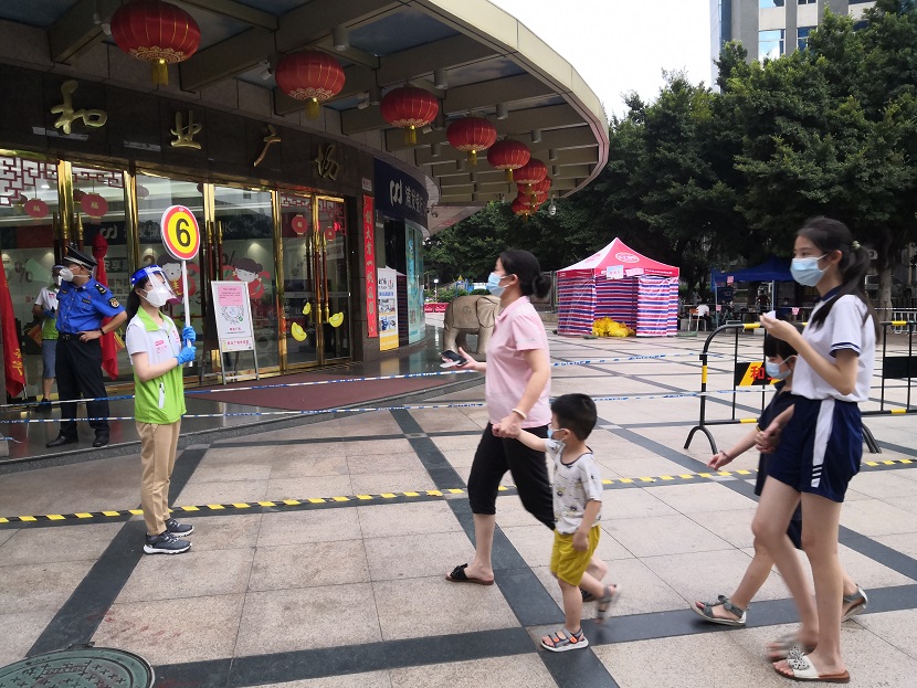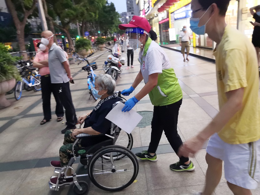(照片組圖:志愿者耐心解釋,合理指引老人、小孩使用綠色通道,其他居民分批次進(jìn)行檢測(cè),做到不擁擠不扎堆。)