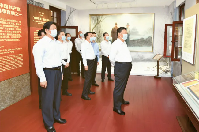2021年6月25日,中共中央政治局就用好紅色資源、賡續(xù)紅色血脈舉行第三十一次集體學(xué)習(xí)。這次集體學(xué)習(xí)采取參觀和討論相結(jié)合的形式,這是習(xí)近平、李克強(qiáng)、栗戰(zhàn)書、汪洋、王滬寧、趙樂際、韓正等在北大紅樓參觀“光輝偉業(yè) 紅色序章——北大紅樓與中國(guó)共產(chǎn)黨早期北京革命活動(dòng)主題展”。 新華社記者 謝環(huán)馳/攝